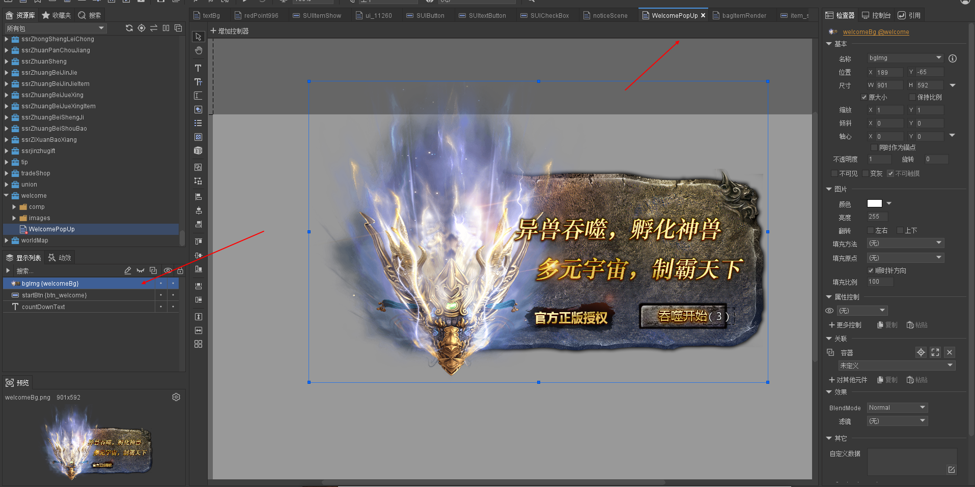 入门教程开始游戏本页总览开始游戏创建角色二次确认内容可在 ui_projs\game\FGUIProject.fairy 工程修改欢迎界面 内容可在 ui_projs\game\FGUIProject.fairy 工程修改客戶端面板分区说明