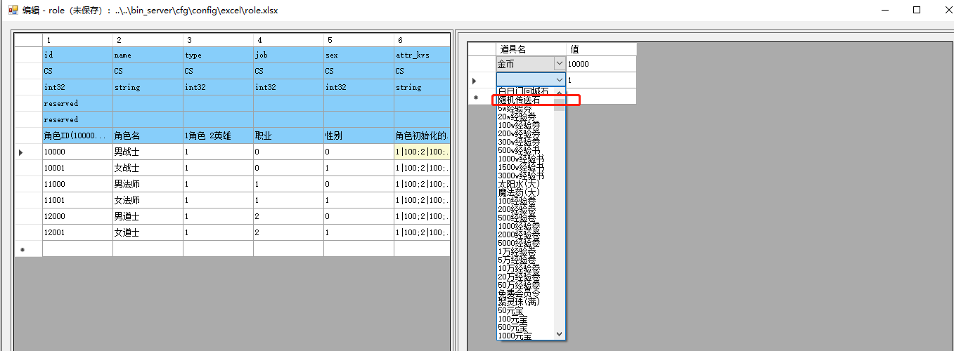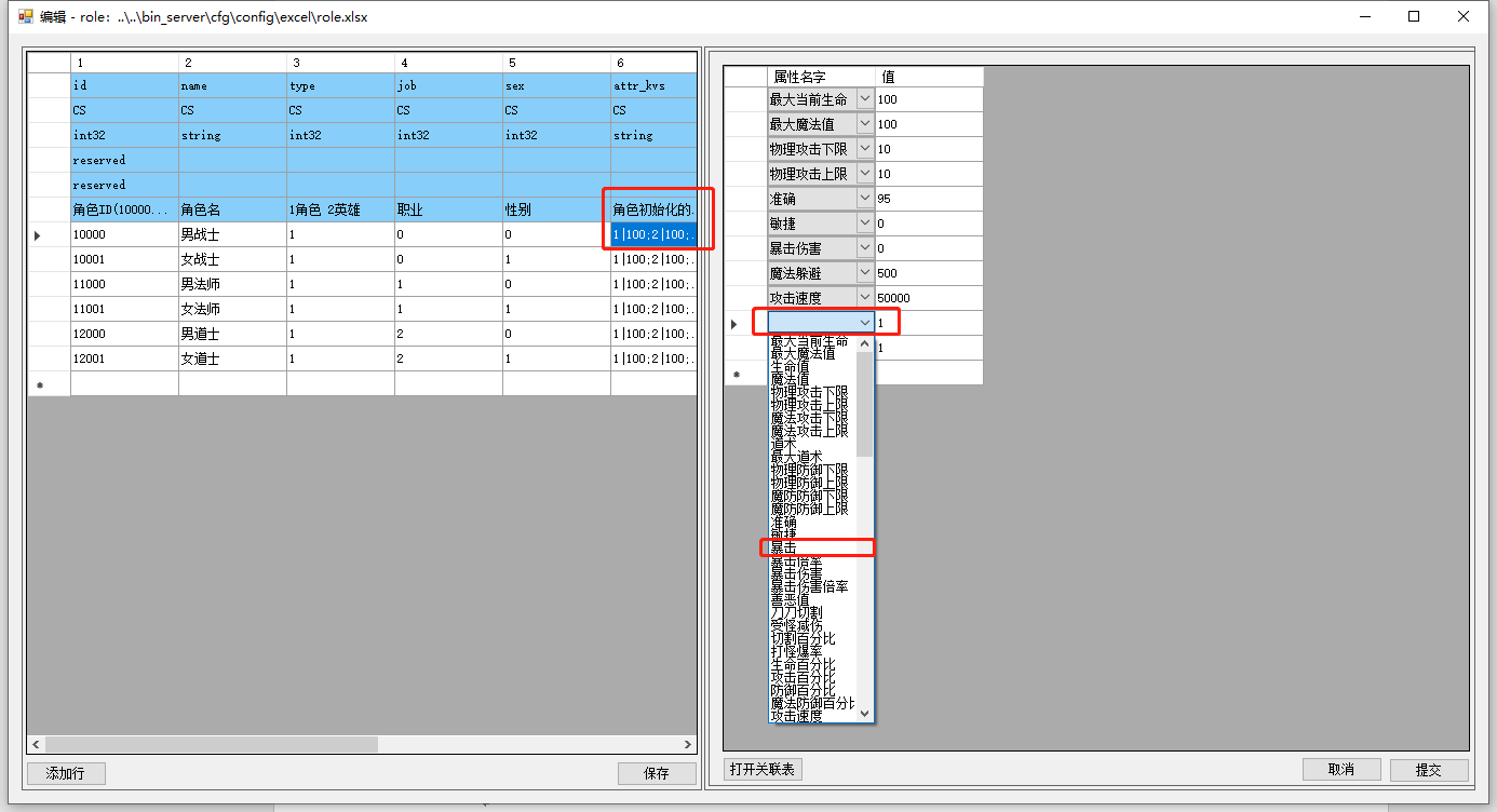 单击要编辑的字段,比如角色初始属性。在弹出界面中点击空白项。选择要新增加的属性。
